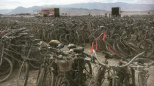 Supposedly, the lack of trash cans and dumpsters at Burning Man is supposed to make attendees more “aware” of their garbage production. But it also means the event organizers don’t have to pay for garbage removal — and it helps them hide how much waste is truly produced. In 2017, some 5,000 bikes were left behind.