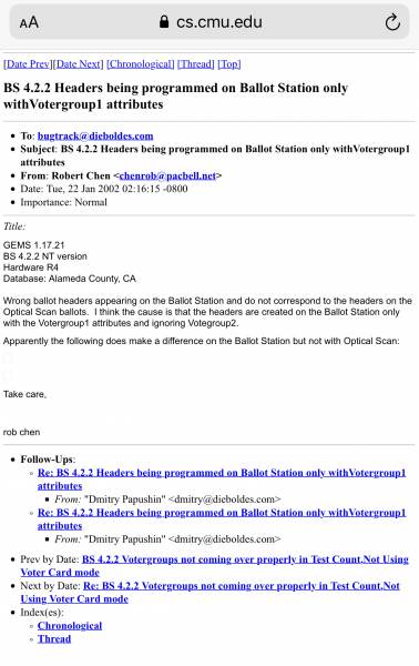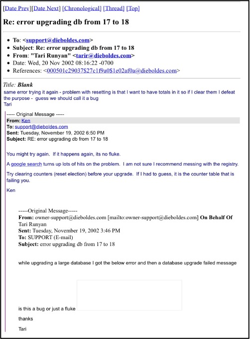 While Diebold denounced these claims, email threads I acquired through digging indicate their knowledge of said bugs in some form or another in their systems and how circumventing was done to avoid detection including halting google searches on the company and the keyword bug, as to not increase the chances of those two keywords coming up in the registry upon searching the company.