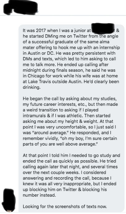 Several other young men approached me throughout the summer with more allegations against Weaver. One young man, a junior in college, told me Weaver would start direct messaging him on Twitter, saying he could offer him an internship in Austin, Texas, or Washington, DC. The direct messages were persistent and led to them exchanging phone numbers and texting about the student’s professional ambitions.