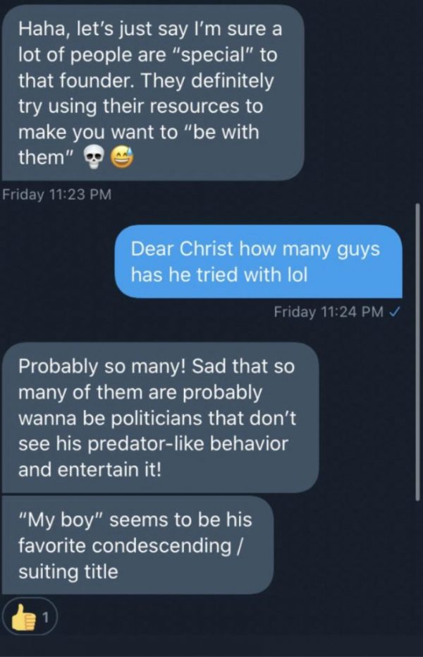 As they continue to grift and target private citizens who worked for the administration, it’s important to point out that one of their founding members was using their organization and the promise of a job in politics to prey on young men. The question remains, though, of how many other founding members knew about it and were complicit.