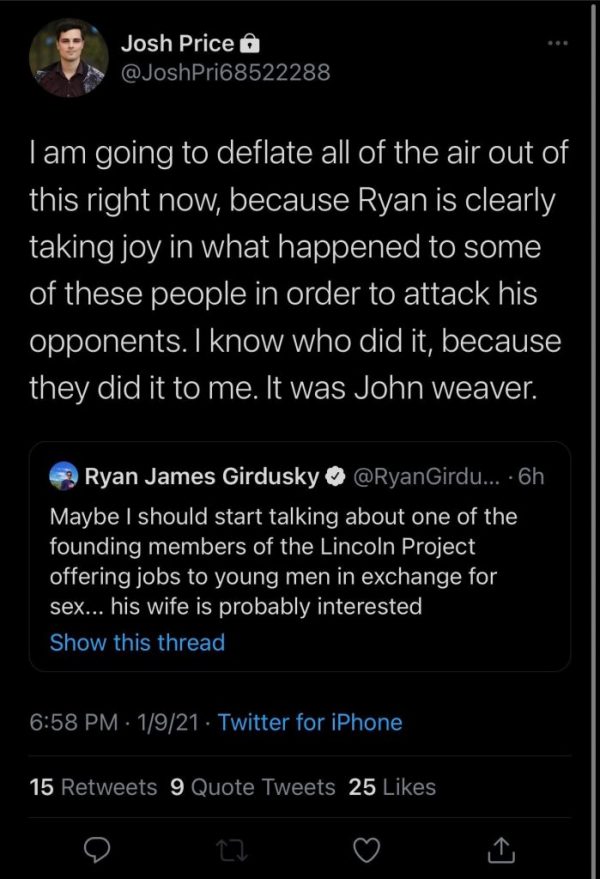 The tweet set off a firestorm of responses, including one by a young man named Josh Price who tweeted, “I am going to deflate all of the air out of this right now because Ryan is clearly taking joy in what happened to some of these people in order to attack his opponent. I know who did it because it happened to me. It was John Weaver.”