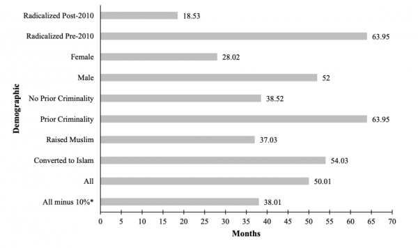 Counter-terrorism experts suggest the median radicalization time is over four years long, with 10 percent of those studied taking a decade or longer to influence with extremist propaganda.