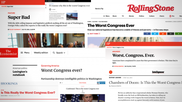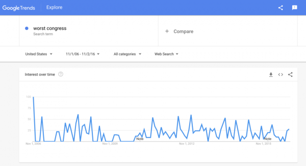 The phrases “worst Congress” and “worst Congress ever” bring up tens of thousands of results on search engines, and Google trends shows the phrase obtaining spikes in user searches whenever the media has promoted stories of that nature.